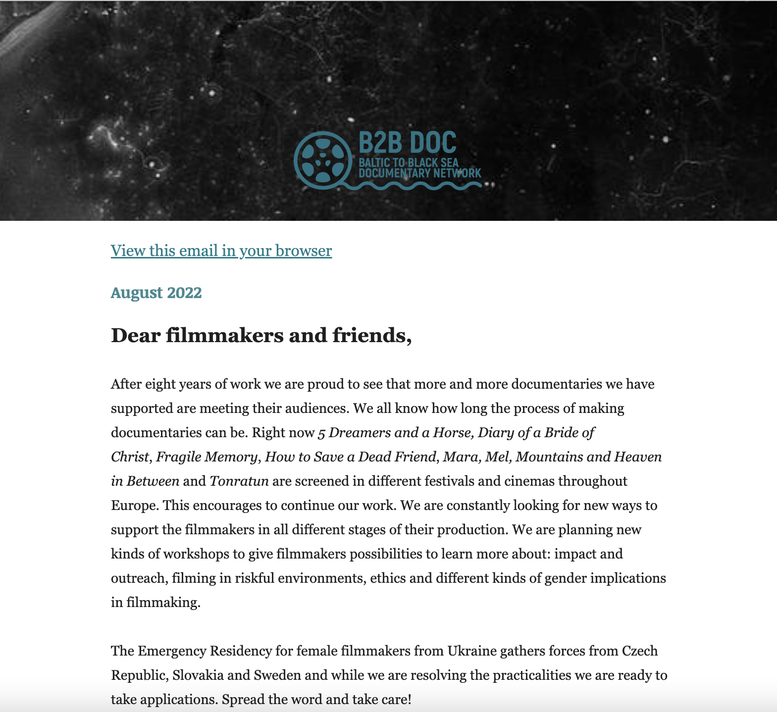 We invite you to celebrate B2B Doc 10 years anniversary together with us! We can promise interesting discussions, new connections and of course - documentary film from the B2B Doc countries.